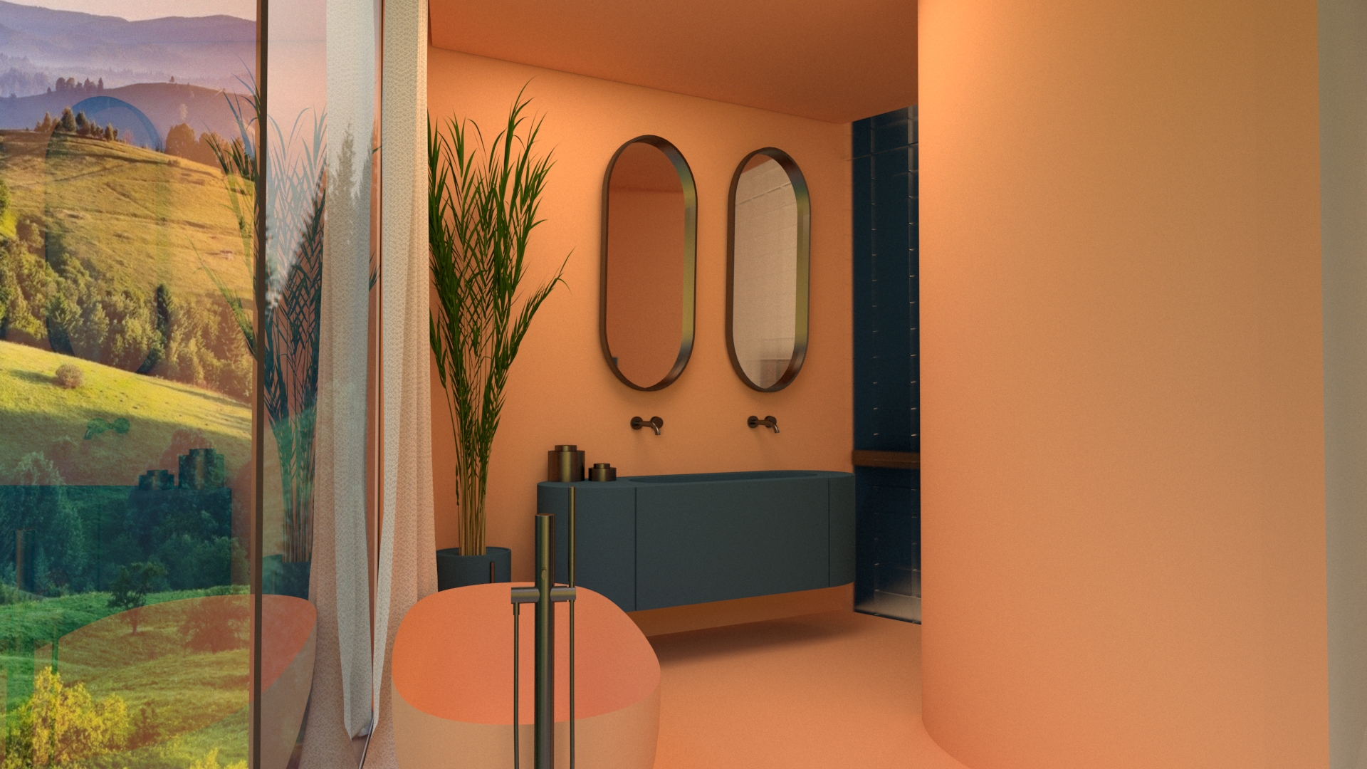 En la zona de trabajo, la mesa suspendida y la silla metalizada se iluminan mediante luz filtrada por un muro de vidrio esmerilado. El dormitorio cuenta con cama frente a un ventanal, armario con puertas espejo y espacio de almacenamiento, televisión con escultura circular retroiluminada y mesitas con apliques lineales. El vestidor y baño presentan curvas en la pared con iluminación foseada, bañera exenta naranja, lavabo de diseño con doble monomando y espejos gemelos.