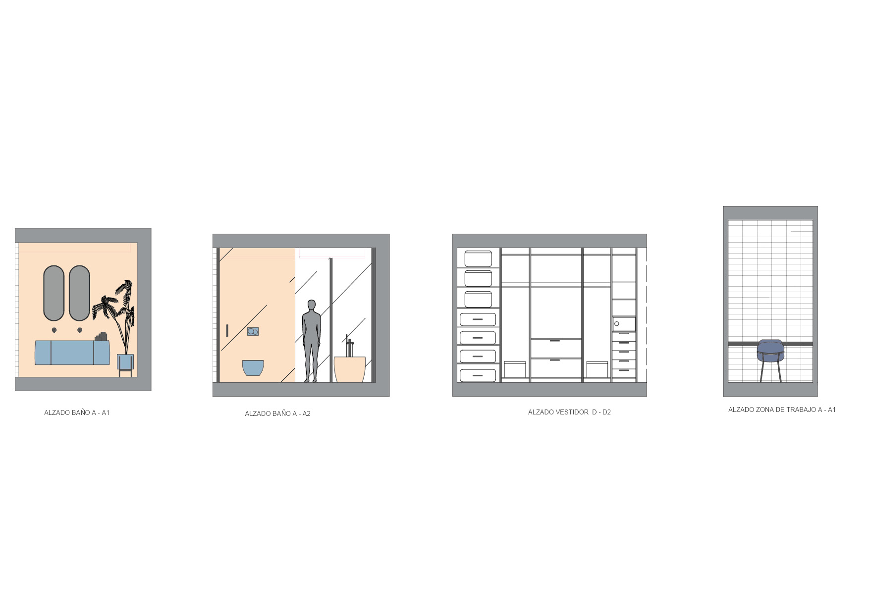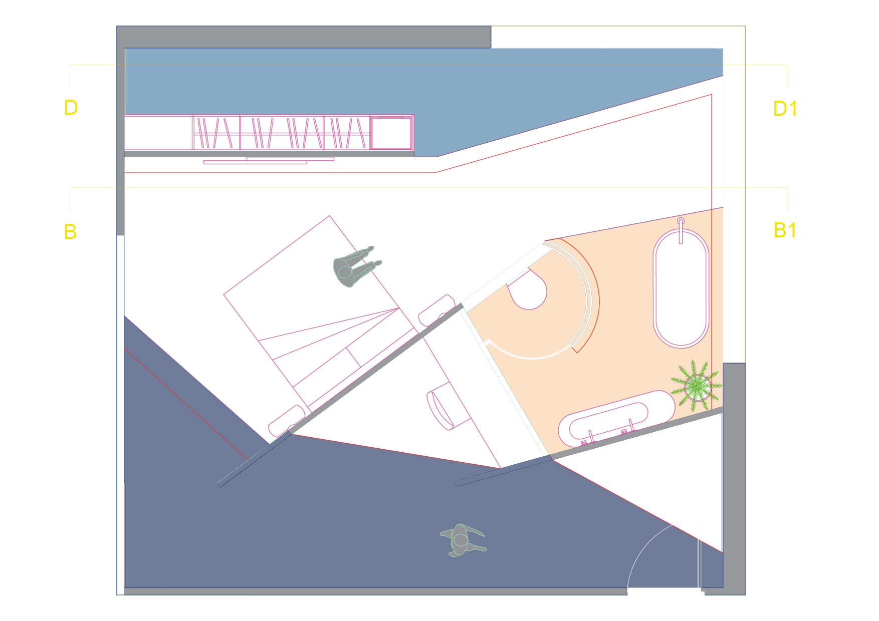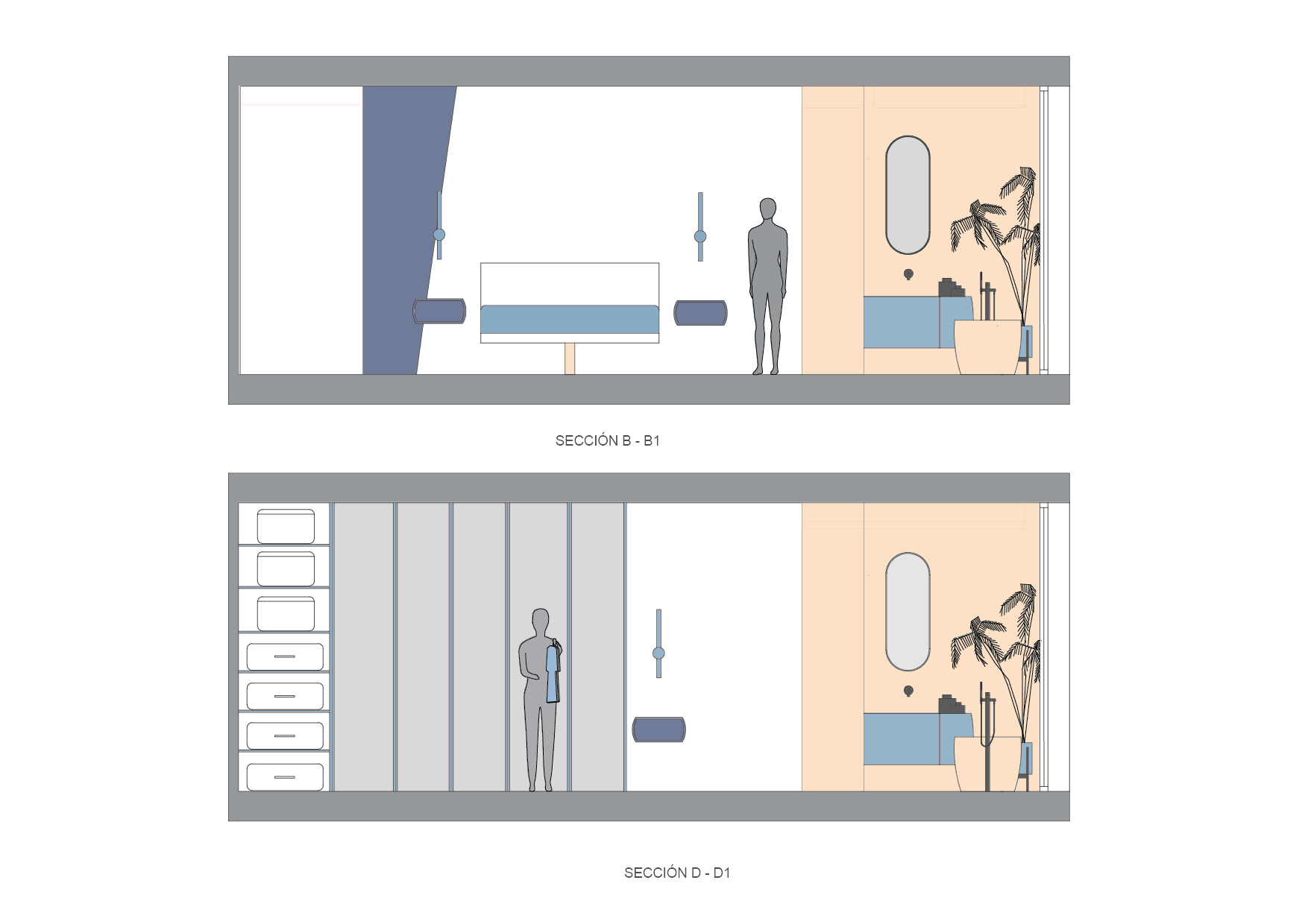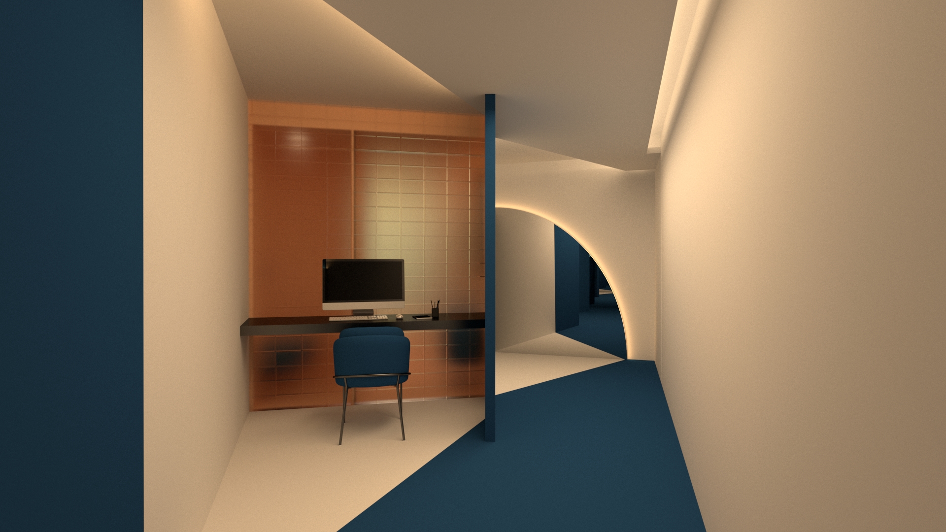 La habitación de hotel está organizada en entrada, zona de trabajo, dormitorio, vestidor y baño, con mobiliario diseñado específicamente para el proyecto. Se utilizan formas geométricas en suelo, paredes y techo, y una paleta cromática que combina azules (calma y protección), naranja (alegría) y blanco (pureza).